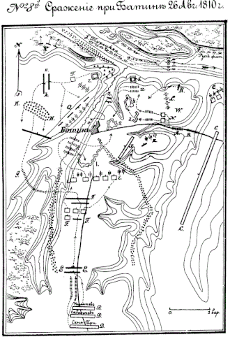 In early August the advancing Ottoman army, some 40,000 strong (incl. of 15,000 Albanians under Muhtar Pasha and 6–7,000 selected army of three-tug Ahmed Pasha[2]), clashed with Russian troops under General Uvarov who had been sent to delay them. Uvarov retreated before them but to his surprise the Turks halted their advance and dug in. Kamensky contacted his brother at Shumen and ordered him to meet him at Batin with 10,000 of his men and, having left a force to guard Rustchuk, set off with 10,000 of his own men to the rendezvous.