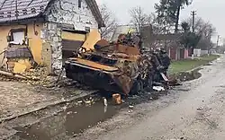 On 10 March, at Skybyn village near Brovary,[6] Ukrainian forces saw an opportunity to ambush the Russian troops and attacked. Using artillery and antitank missiles, the Ukrainians disabled several tanks and armored personnel carriers.[5] A Ukrainian soldier later stated that the ambushers initially targeted the first and last vehicles in the convoy to trap the rest in the middle. The attack was not entirely successful, as the Ukrainians were unable to cut off the Russians' route of retreat.[4] However, the Russian column suffered heavy losses and was forced to retreat.[7][8] Ukrainian officials claimed that the commander of the 6th Tank Regiment, Colonel Andrei Zakharov, was killed in the skirmish.[1][9] Some Russian soldiers reportedly fled on foot into the nearby woods and villages.[5]