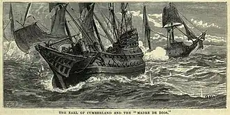 ![]() The battle between the Earl of Cumberland and the Madre de Dios envisaged in a 19th-century English drawing | |||||||