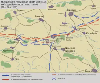 The Allied forces inflicted a heavy defeat on the Russian army,[4] capturing all three commanders including Romodanovsky's son Andrei. On the next day, the Tatar-Cossack army clashed with the Russians at Konotop and inflicted a heavy losses on them in the course of 5-day battle, but once again failed to achieve a complete victory as the Russian army retreated towards Putyvl.[5] The victories at Gaivoron and Konotop did not bring a strong control over the Left-bank for Doroshenko as the Crimean Tatars switched to the side of Petro Sukhoviy, who was elected by the Zaporozhian Cossacks as "Hetman of the Zaporozhian Host" in September 1668. In December 1668, Mnohohrishny was elected as the hetman of Left-bank Ukraine and in March 1669, he signed the Hlukhiv articles.[5]