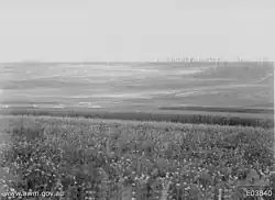 Pear Trench was south-west of Hamel on the "reverse slope of a gentle spur", Pear Trench formed the centre of the 4.0 mi (6.5 km) front over which the Australians attacked.[45] The 15th Battalion, from the 4th Brigade, was assigned to assault the position supported by three tanks.[11][38] From the outset things went awry. The tanks the 4th Brigade had been assigned got lost in the darkness and were late, the artillery preparation in this sector had fallen short, and some shells had landed among the 15th Battalion as they had formed up for the assault, causing casualties and leaving part of the German defences free to engage the infantry with machine-gun fire.[38]