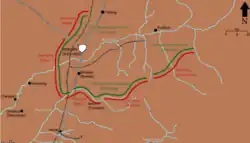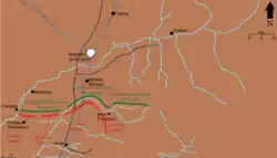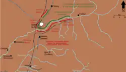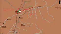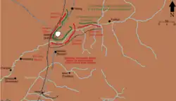 Positions of armies by 23 February, the Army of Manchuria of the Imperial Japanese Army in red and the Imperial Russian Army in green.