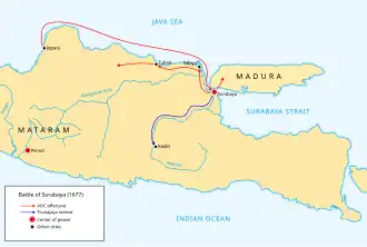 VOC forces proceeded to clear the rebels from the area surrounding Surabaya.[11] Two VOC detachments—Indonesian companies led by Dutch captains—were sent northwest along the coast, clearing the rebels in the areas surrounding Sidayu, Tuban and the Kendeng mountains with no losses.[2][12] Speelman also sent envoys, including Indian traders, to Kraeng Galesong at Pasuruan.[13] Galesong was a former ally of Trunajaya who had quarreled with him and remained neutral during the battle in Surabaya.[14] This negotiation failed in early May, and Galesong refused to submit even after Trunajaya's defeat in Surabaya.[13][2] The VOC also tried to gain the loyalties of the lords of Madura, Trunajaya's home island across the strait from Surabaya.[2] Several Madurese lords submitted to the admiral as the representative of the Mataram king in late May, and Speelman tried to install one of them, Raden Martapati, as a proxy.[2] However, Martapati's authority collapsed in the face of Trunajaya loyalists as soon as his VOC escorts left Madura, and he was forced to flee to Surabaya.[2] Subsequently, Speelman himself sailed to Madura, defeated Trunajaya's allies there, and razed his residence, Maduretna.[2][13] However, in late June the court of Mataram itself fell to Trunajaya's forces, and the king fled.[13] Upon receiving this news, Speelman decided to sail immediately to defend the strategic point of Jepara and link up with the retreating royal forces.[15]