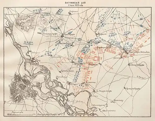 There was perhaps further justification for this choice on a tactical level: the broken and wooded terrain in the immediate proximity of the Danube was adapted to fighting in open order formations, which were insufficiently mastered by his men, and at which the French were adept. This was, without a doubt, one of the bitter lessons that the Austrians learned at Aspern and Essling. But above all, the cautious Archduke Charles was unwilling to take the risk of committing his forces in such an advanced position, knowing that he would have a hard time extricating them, should retreat have become necessary. He also planned not to face the enemy on the flat plains of the Marchfeld, an ideal cavalry terrain, where the numerically superior French horse would quickly gain the upper hand.[28] The two influential staff officers, Wimpffen and Grünne, had been actively advocating for this position for weeks and this time Charles finally acquiesced to their point of view.[29]