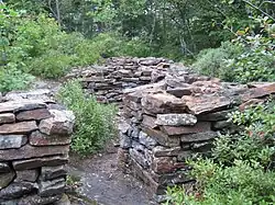 The ruins consist of walls outlining a small five-sided building and a 150-metre wall with ditches,[1][2] both made with flat-surfaced ironstone slate rocks on the slope of a hill overlooking the Bayers Lake Park. The mysterious ruins pose many unanswered questions for archaeologists.[3] The most simple and humble explanation suggests a sheep pen, but some envision a military purpose, either a training installation or a defensive work. The walls are a protected archaeological site designated under Nova Scotia's Special Places Act.[4][5][6][7][8][9] The site is included within the historic limits of one of the nine original Dutch Village grants issued in 1762 – a 150-acre grant assigned to Johann Gotlieb Shermuller. Schermuller sold the property in 1770 and moved to Philadelphia, where he became a butcher. The site changed hands many times after 1770. However, given its ground conditions, it is unlikely to ever have been farmed. The only structure on the property for which there is known documentary evidence is Feature 2. A 1918 map depicts a building standing in approximately the location of the site steps. (DMD 1918).[10]