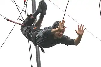 Bear Grylls on a flying trapeze in 2016 during a Bush Scout UK event