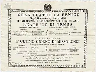 Although unsuccessful at its premiere in Venice in 1833, Bellini felt that he had counteracted the horror of its story "by means of the music, colouring it now tremendously and now sadly".[2] Later, after hearing of the opera's success in Palermo, Bellini wrote to his Neapolitan friend Francesco Florimo, stating that Beatrice "was not unworthy of her sisters".[3] Also, it was Pasta's performances in the title role that overcame the public's hostility to the piece.