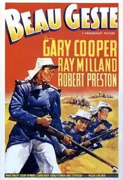 Beau Geste is a 1939 American adventure film starring Gary Cooper, Ray Milland, Robert Preston, Brian Donlevy, and Susan Hayward. Directed and produced by William A. Wellman, the screenplay was adapted by Robert Carson, based on the 1924 novel of the same title by P. C. Wren. The music score was by Alfred Newman and cinematography was by Theodor Sparkuhl and Archie Stout.
