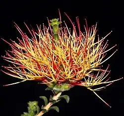 The flowers are red, orange and yellow and are arranged in dense heads on the ends of branches which continue to grow after flowering. Interspersed between the flowers are tufts of white hairs. The flowers have 5 sepals, 5 petals and 5 bundles of stamens. The stamens are usually yellow to orange in the lower half with red ends and are joined for about half their length. The 5 separate filaments extending beyond the joined part but branching at two different points. Flowering occurs throughout the year but mainly from October to January, and is followed by fruit which are woody capsules, arranged in small clusters around the stem.[3][4][2]