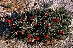 This beaufortia grows in sandy soils, sometimes with clay, gravel or loam often over laterite or granite. It occurs between Latham, Dumbleyung, the Wandoo National Park and Jilbadji Nature Reserve in the Avon Wheatbelt, Coolgardie, Esperance Plains, Geraldton Sandplains, Jarrah Forest, Mallee and Swan Coastal Plain bioregions of south-western Western Australia.[3][8] It is an important component of kwongan vegetation.[9]
