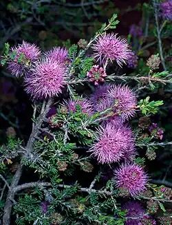 The flowers are arranged in heads on the ends of the branches and have 5 sepals, 5 petals and 5 bundles of stamens. The stamens are deep pink to red or maroon and joined for about 1.5–4 mm (0.06–0.2 in) of their length into a "claw" which is hairy on one side. The 5 or 6 stamens in each claw all spread from the same point on the claw and are a further 1–4 m (3–10 ft) long. Flowering occurs throughout most of the year but especially in spring and early summer and is followed by fruit which are woody capsules 7–11.5 mm (0.3–0.5 in) long and 4.5–6 mm (0.18–0.24 in) wide.[2][3]