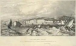 Beaumaris was a haven of refuge in a storm to the passengers of the sailing ship, Everton, on a Thursday morning in November,1762 when it ran aground on a nearby sand bank. The ship's Captain, knowing nothing could be done before high tide six hours hence, ordered the yawl to be lowered carrying himself and all the passengers to shore for fresh provisions in the town. One of those passengers was Devereux Jarratt from Virginia who was voyaging to London to receive holy orders from the Bishop of London in the Church of England. He writes in his autobiography, "As I had eaten nothing for several days, but salt beef, ranced butter, black biscuit, &tc. while on board, the meat, butter, and every thing I ate, at Beaumaris, exceeded any thing I ever had tasted in all my life. Having refreshed ourselves, in the most delicious and agreeable manner, we took a view of the town, and the remains of an old castle standing just without the town, which had been erected as a place of security and defence, by one of the first kings of England. Every thing appeared so delightful, and the inhabitants looked so fresh and ruddy, that I thought no people in the world could live better than the Welsh. The high mountain of Penmanmaur, lying over against the town, with the top in the clouds, and all the visible parts covered with snow, exhibited the most grand and majestic appearance, I had ever seen."[15]