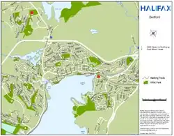 Bedford is approximately 18 km (11 mi) from Downtown Halifax.[7] Bedford covers 3,979 hectares (39.79 km2) of land area.[8] As Bedford is quite centralized in the municipality its borders are formed by the community boundaries it shares with its neighbours. To the north are the communities of Lower Sackville, Lakeview and Waverley and Dartmouth are to the east, Halifax and Timberlea to the south and finally Hammonds Plains to the west.