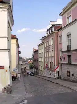The Bednarska Street in Warsaw, Poland, is a street in Warsaw's Śródmieście borough, and is the narrowest street in Warsaw (5.3 m). The street received its current name before the year 1743, stemming from its upper part consisting of houses inhabited by artisans, probably mainly by coopers (bednarz being the Polish word for cooper). Officially, the name was given in 1770.[1][2]