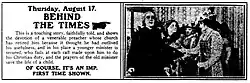 Behind the Times is a 1911 short film by Thomas H. Ince with Owen Moore, Ethel Grandin, and Lucille Young.[1] According to a contemporary newspaper, the story is about the conflict between an old priest who is asked to retire and a young priest who can't do the job properly.[2]
