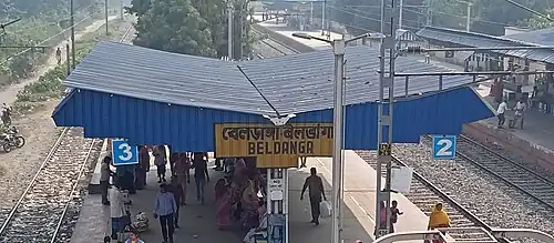 Beldanga is a railway station of the Sealdah-Lalgola line in the Eastern Railway zone of Indian Railways. The station is situated beside National Highway 12 at Beldanga in Murshidabad district in the Indian state of West Bengal. It serves Beldanga town and the surrounding villages. Total 34 trains including Hazarduari Express, Lalogola Passengers and few EMUs pass through the station.[1][2] The distance between Sealdah and Beldanga is 168 kilometres (104 mi).[3]