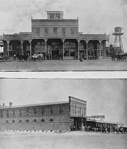 The Belén Harvey House is located within feet of the BNSF rail yard. It is a two-story building that opened in 1907, one year before the completion of the Belén Cutoff, to provide room and board to railroaders and others passing through.[12] The original Belén rail depot is adjacent to the Harvey House grounds, owned by BNSF and used as office space for the railroad.