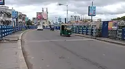 Feeder road is one of the main roads in Belgharia. Feeder road connects Belgharia to Barrackpore Trunk Road (B.T. Road) on the west and through Madhusudan Banerjee Road (M.B. Road) to Nimta, Birati and consequently to Jessore Road in the east. Feeder Road and Madhusudan Banerjee Road (M.B. Road) are connected with a rail over-bridge named Kabi Satyendranath Dutta Setu above Belgharia railway station.[9] The nearest metro station is Baranagar metro station on the Kolata Metro's Blue Line, located at an approximately 3.4 km distance from Belgharia railway station. The newly built Belghoria Expressway which links with Dumdum/Kolkata Airport on Jessore Road and Nivedita Setu on the Hooghly River increased the importance of this place.