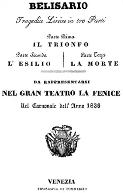 Belisario (Belisarius) is a tragedia lirica (tragic opera) in three acts by Gaetano Donizetti. Salvadore Cammarano wrote the Italian libretto after Luigi Marchionni's adaptation of Eduard von Schenk's play, Belisarius, first staged in Munich in 1820 and then (in Italian) in Naples in 1826.[1] The plot is loosely based on the life of the famous general Belisarius of the 6th century Byzantine Empire.