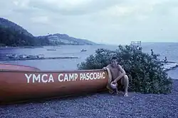 Camp Pascobac camper with Belleisle Bay in the background (ca. 1965).