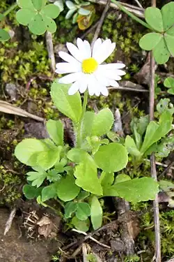 B. sylvestris - Perennial, like B. perennis but with longer flower stems (10-45 cm) and longer (3-18 cm) leaves with 3 veins that gradually narrow to their base, and slightly larger flower head (2-4 cm).[5][6]