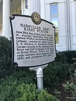The first radio station in Nashville went on air in May 1922 when John "Jack" DeWitt Jr., a high school student, installed a twenty-watt transmitter at Belmont. The station, WDAA, was born when Dr. C. E. Crosland, Associate President, realized the potential advertising value to the college of a radio station. The WDAA program on April 18, 1922, marked the first time a music program was broadcast in Nashville. The broadcast could be heard 150 to 200 miles (320 km) from the school.[19]