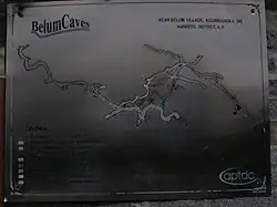 The Belum Caves, located in Nandyala district of Andhra Pradesh's Rayalaseema region, is the second largest cave system on the Indian subcontinent, known for its speleothems, such as stalactite and stalagmite formations. The Belum Caves have long passages, galleries, spacious caverns with fresh water and siphons. This cave system was formed over the course of tens of thousands of years by the constant flow of underground water from the now-disappeared river Chitravathi. The cave system reaches its deepest point (46 m (151 ft) from entrance level) at the point known as Pataalaganga.[1] Belum Caves have a length of 3,229 m (10,593.8 ft), making them the second largest caves on the Indian Subcontinent after the Krem Liat Prah caves in Meghalaya. It is one of the centrally protected Monuments of National Importance.[2]