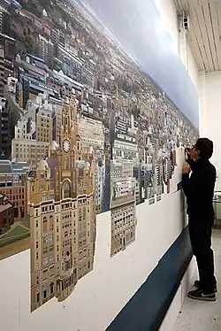The Liverpool Cityscape comprises 170 hectares of the city, a near bird’s-eye perspective. It encompasses several thousand individual buildings and took Johnson and up to 11 assistants 24,000 person hours to complete it. In making The Liverpool Cityscape, Johnson explored the city, (taking over 3000 reference photographs) considered alternative viewpoints, consulted with architects and historians, as well as the people of Liverpool, and absorbed the city’s distinctive atmosphere. Thousands of detailed drawings were produced before the execution of the painting in minute detail.[11]