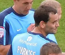 New manager Bruno Ribeiro appointed Purkiss as joint-captain, along with Jak Alnwick and Anthony Grant, in July 2016.[56] He played 12 of the club's first 15 league matches of 2016–17, though was twice unexpectedly dropped from the matchday squad entirely despite not being injured on either occasion.[57] Chairman Norman Smurthwaite confirmed that there had been an issue between Purkiss and Ribeiro.[58] However, it was reported that Purkiss was unable to return to the first-team due to a shoulder injury.[59] He made his return to action under caretaker manager Michael Brown on 30 December, days after Ribeiro's resignation.[60] Pukiss went on to state that he had been genuinely injured and that rumours of a falling out with Ribeiro were an exaggeration.[61] Vale were relegated at the end of the season, after which Purkiss questioned the fitness and conditioning of the squad.[62] After a public vote held in December 2019, he was named by The Sentinel as Port Vale's third-best right-back of the 2010s with 11% of the vote, behind Adam Yates (62%) and James Gibbons (27%).[63]