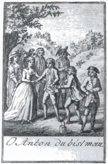 It was around this time that Schack became a friend and professional colleague of Mozart, who was gradually increasing his involvement with Schikaneder's troupe. Schack apparently asked his friend for advice and help in composing,[4] and the level of assistance evidently increased. The following anecdote was published in the Baierisches Musik-Lexikon by Felix Joseph von Lipowsky (Munich, 1811):
