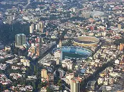 Next door to each other are the Estadio Azul (lit. Blue Stadium) and the Plaza México bullring, also on the west side of the borough. The two were constructed as part of a large project called the Ciudad de los Deportes (Sports City). This project was conceived in the late 1930s to cover what was formerly the San José Hacienda. The complex was to include swimming pools, a baseball field, an indoor jai alai court along with several outdoor ones, boxing and lucha libre rings, theatres, forty tennis courts, restaurants and parking for over two thousand cars. However, the developer went bankrupt with only the bullring near completion. This bullring was begun in 1944 and opened in 1946. It was built to replace the El Toreo ring in the La Roma neighborhood, which dated from 1907. The new facility was built with the express purpose of being the largest in the world. The bullring covers a surface of 1452m2 with a 43-meter diameter. The stands extend up for 35.9 meters and the sand area is twenty meters below street level. There is seating for between 45,000 and 48,000 people.[14]