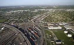 Due to the strong increase in freight traffic during and after World War II, the Milwaukee Road expanded the Bensenville Yard into one of the world's largest marshaling yards with a total of 70 directional tracks by 1953. Covering an area of over 130 hectares, including the entry and exit group, it had around 200 km of track with a total capacity of almost 9,000 freight wagons.[3] In 1958, the Milwaukee Road began piggyback transport of semi-trailers, which meant that the manual reloading of goods could be avoided. A loading station for flat wagons was built on the east side of Bensenville Yard for this purpose, covering an area of almost 19 hectares by the late 1960s. This type of handling in intermodal freight transport was later increasingly replaced by the emergence of ISO containers and the site was developed into a container terminal.[4]