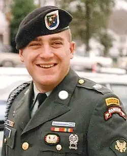 SPC James Smith from 3rd Battalion, 75th Ranger Regiment wearing black beret with original beret flash—note the white border around the flash—c. 1993