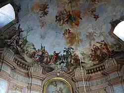 The Bergkirche is architecturally unusual and is built in two parts. The main section, the church proper, is approximately a square. The interior is in Baroque style; Humphreys and Bousfield call it "a trompe-l'œil fantasy in pinks and greys".[2] The ceiling takes the form of a dome, which was painted in fresco in the late 18th century by J. W. Baumgartner.[3]