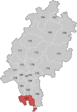 Bergstraße (English: Mountain Road) is an electoral constituency (German: Wahlkreis) represented in the Bundestag. It elects one member via first-past-the-post voting. Under the current constituency numbering system, it is designated as constituency 187. It is located in southern Hesse, comprising the district of Bergstraße.[1]