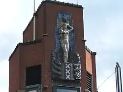 The banks on either side were integrated into the design, with boathouses on the Weesperzijde (east) and a marina on the Amsteldijk (west). The control tower (placed eccentrically) and the bridgekeeper's house had been designed as round buildings, but this was changed to rectangular.[6] The boathouses on the east side (which were built after World War II) end at the Schollenbrug, which was part of the design and is listed with the Berlagebrug as the Rijksmonument.[1] Sculptor Hildo Krop was contracted to provide ornamentation for the bridge; his glazed earthenware relief of the Genius van Amsterdam (the city's protective spirit) was placed on the west side of the bridge's control tower in 1932.[7] The relief was made by a firm in Delft, De Koninklijke Porceleyne Fles. The figure stands on top of three green bands which symbolize the city's Grachtengordel and come together in the city's banner. The middle of the bridge's five spans is the bascule bridge. Berlage used red bricks from Limburg, alternated with yellow granite from Bavaria. Green glazed stone was used as well, and the wrought iron railings were painted black and red, as were the light posts and the electricity poles for the streetcars.[6]