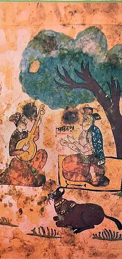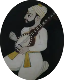 Bhai Mardana (Punjabi: ਭਾਈ ਮਰਦਾਨਾ; 1459 — 1534[1]) was one of the first Sikhs and longtime companion of Guru Nanak Dev, first in the line of gurus noted in Sikhism. Bhai Mardana was a Muslim by-birth who would accompany Guru Nanak Dev on his journeys and became one of his first disciples and followers, and converted to the newly established religion.[2][3] Bhai Mardana was born to a Mirasi Muslim[4] family, a couple, Badra and Lakkho, of Rai Bhoi di Talwandi, now Nankana Sahib of Pakistan. He was the seventh born, all other children had died at birth. He had very good knowledge of music and played rabāb when Guru Nanak sung Gurbani. Swami Haridas (teacher of Tansen) was the disciple of Bhai Mardana and learnt Classical Music from him.