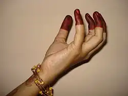 Lastly, all dancers outline their hands and feet with red kumkum powder or alta, a tradition that helps the audience easily see their hand and foot gestures.[102]