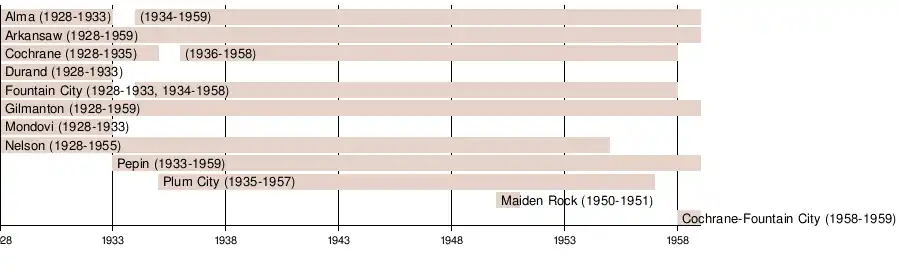 The Bi-County League was formed in 1928[1] by eight small high schools near the Mississippi River in west central Wisconsin: Alma, Arkansaw, Cochrane, Durand, Fountain City, Gilmanton, Mondovi and Nelson.[2] All original members were located in two counties (Buffalo and Pepin), which is where the name originated from. Five years after it was founded, the conference lost three members to the new Mississippi Valley Conference (Alma, Durand and Mondovi),[3] along with a fourth becoming an independent in Fountain City. Pepin replaced the four departing schools, bringing the membership tally to five.[4] Alma and Fountain City rejoined the Bi-County League in 1934[5] to bring membership back up to seven schools. Plum City joined the Bi-County League in 1935,[6] replacing Cochrane after their exit. They would rejoin the next year,[7] bringing the conference back up to eight members. It would stay at this number for most of the next two decades, save for a season when Maiden Rock was the Bi-County League's ninth school.[8][9]