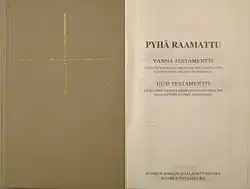The official translation used by the state church, the Evangelical Lutheran Church of Finland, is approved by its Synod.[1] There have been three official translations: Biblia, se on Coco Pyhä Ramattu Suomexi (1642), Pyhä Raamattu (1933/1938),[2] and the current one Uusi kirkkoraamattu (1992/2007). The term kirkkoraamattu means that the edition has to be suited for service of worship and other needs of the church.[3]