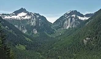 During the Pleistocene period dating back over two million years ago, glaciation advancing and retreating repeatedly scoured the landscape leaving deposits of rock debris.[5] The U-shaped cross section of the river valleys is a result of recent glaciation. Uplift and faulting in combination with glaciation have been the dominant processes which have created the tall peaks and deep valleys of the North Cascades area.