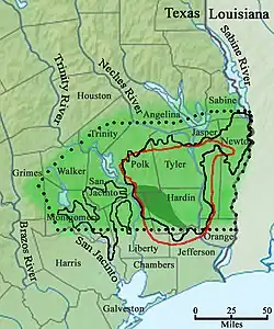 Conservatively the area occupies all of Hardin County, most of Polk, and Tyler Counties, and parts of Jasper, Liberty and San Jacinto Counties, including areas between the Neches River on the east, the Trinity River on the west, Pine Island Bayou on the south, to the higher elevations and older Eocene geological formations to the north. Broader interpretations have included the area between the Sabine River on the east and the San Jacinto River on the west including much of Montgomery, Newton, Trinity, and Walker Counties, as well.[6][9][13] Several attempts to define the boundaries of the Big Thicket have been made, including a biological survey in 1936 which included over 3,350,000 acres (13,600 km2) covering 14 counties.[14] A later botanical based study in 1972 included a region of over 2,000,000 acres (8,100 km2).[15] This same habitat extends into Louisiana and eastward.[16]