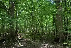 On a larger scale of ecoregions of the United States, the Big Thicket is part of the Piney Woods.[24] The Big Thicket is located in the southwest of the Piney Woods and transitions into the Western Gulf coastal grasslands[25] immediately to the south. To the west are the Texas Blackland Prairies and East Central Texas forests[26] (a.k.a. post-oak savanna). Within the Big Thicket, a major component in the high diversity of plants and animals is the variety of ecosystems present in a relatively small area. The National Park Service identifies eight plant communities in Big Thicket National Preserve.[27] Some biologist and plant ecologists identify as many as nine, ten, or eleven ecosystems in the Big Thicket.[5][6][13] In nature these ecosystems are not always found in pure, large tracts of land, and often occur in intertwined and checkerboard mixes and ecotones, transitioning into one another. Ecosystems do not have universal standardized names. Many ecologist, botanist, zoologist and others have studied and classified ecosystems in the Big Thicket region (and elsewhere), defining and naming these communities as relevant to their own disciplines and studies.[28][5] Although the exact names, definitions, and boundaries might vary (subdivided, compounded, or overlapping), below are summaries of ten major ecosystems recognized by most who have studied and written about the Big Thicket, starting with higher elevations in the north, and in a generalized way, moving to lower elevations in the south.