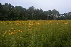 Savannas (aka: longleaf - black gum savannahs;[6] wetland longleaf pine savannas;[29] wetland pine savannas;[28] pine savannah wetlands[5][13]) If the sandylands described above resemble a well drained and arid version of the uplands, the savanna wetlands might be described as a poorly drained, wet version. This ecosystem is characterized by the same open spaces with widely spaced pine trees as uplands and sandylands, but differs in being very flat, with a relatively thin layer of low nutrient, fine, packed sand, sitting on hardpan which is very near the surface. The nearly impervious hardpan both inhibits drainage in wet periods as well as prevents moisture from rising in dry periods. The severity of the fluctuating water table, along with occasional low-intensity ground fires that are necessary to sustain this ecosystem, limit the plants that can grow there. Savanna wetlands are most often found to the south of the uplands, on the Montgomery and recent Bentley formations, although they are not entirely restricted to this zone. Longleaf pine (Pinus palustris) along with black gum (Nyssa sylvatica), often stunted, make up much of the overstory, being among the few trees that grow in the severe conditions. Ground cover is dominated by rushes, sedges (Rhynchospora and Scleria), and grasses including Andropogon, Aristida, Muhlenbergia, and little bluestem (Schizachyrium scoparium). Within the flat savannas, the slightest change in elevation can produce significantly different vegetation. Occasional mounds with two or three feet of sand, support upland habitat, while depressions of just a few inches can hold acid bogs, with low pH levels and low levels of nutrients such as nitrogen, potassium, phosphorus, and calcium. Even the peripheral areas around acid bogs, distinguished by subtle sloping elevations of only an inch or two, sustain a distinct zone of vegetation. Sphagnum mosses and carnivorous plants are adapted to these environments, including the pitcher plant (Sarracenia alata), annual sundew (Drosera brevifolia), rush bladderwort (Utricularia juncea), and small butterwort (Pinguicula pumila). A number of orchids are found in savannas including the grass pink orchid (Calopogon tuberosus), yellow fringed orchid (Platanthera ciliaris), snowy orchid (Platanthera nivea), and snake mouth orchid (Pogonia ophioglossoides).[6][13][28]