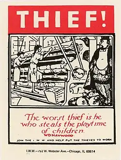 Haywood complained that John D. Rockefeller was "wielding more power with his golf sticks than could the people of Colorado with their ballots."[54] It appeared to Haywood that the deck was stacked, and no enduring gains could be won for the workers short of changing the rules of the game. Increasingly, his industrial unionism took on a revolutionary flavor.[55] In 1905 Haywood joined the more left-leaning socialists, labor anarchists in the Haymarket tradition, and other militant unionists to formulate the concept of revolutionary industrial unionism that animated the IWW. Haywood called this philosophy "socialism with its working clothes on".[14]