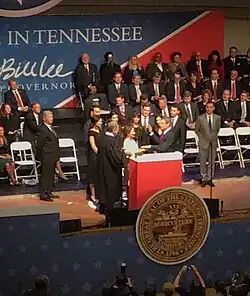 William Byron Lee (born October 9, 1959) is an American businessman and politician who has served as the 50th governor of Tennessee since 2019.[1][2] A member of the Republican Party, Lee was president and chief executive officer (CEO) of the Lee Company, a business operated by his family, from 1992 to 2016.[3]