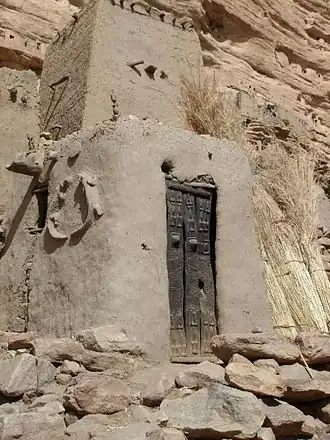 The Binou ceremony is a secret ceremony which takes place in a shrine or sanctuary whose form varies from one village to the next. These shrines are highly decorated, single-chambered building with symbolic reliefs and paintings. As a spiritual leader of the Binou clan, a Binou priest's responsibility is to maintain harmony between clan members or humans, and between humans and the supernatural world. During the ceremony, animals are sacrificed, and libations of millet gruel on the façade of the shrine form an important part of Binou rituals and ceremonies. The millet leaves very clear white markings on the façade.[1] Millet gruel is also poured inside the shrine under the supervision of a totemic Binou priest—who alone can access the interior. The ceremony usually takes place during agrarian rites—which tries to ensure good rainfall and harvest.
