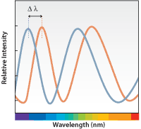 Bio-layer interferometry measures kinetics and biomolecular interactions on a basis of wave interference. To prepare for BLI analysis between two unique biomolecules, the ligand is first immobilized onto a bio compatible biosensor while the analyte is in solution.[5] Shortly after this, the biosensor tip is dipped into the solution and the target molecule will begin to associate with the analyte, producing a layer on top of the biosensor tip. This creates two separate surfaces: the substrate itself, and the substrate interacting with the molecule immobilized on the biosensor tip.[1] This essentially creates a thin-film interference, in which the created layer acts as a thin film bound by these two surfaces. White light from a tungsten lamp is shone onto the biosensor tip and reflected off both surfaces, creating two unique reflection patterns with different intensities.[5] Figure 2 expresses this phenomenon in a more general form. The wavelength shift (Δλ) between these two reflection patterns creates an interference pattern (Figure 3) from which all desired results can be obtained.[1] Since the wavelength shift is direct measure of the change in thickness of the biological layer and the biological layer thickness will change in response to molecules associating to and dissociating from the biosensor, the interference pattern will allow for real-time monitoring of molecular interactions on the biosensor surface.[6] In short, a positive wavelength shift implies an increase in biolayer thickness and thus more association, while a negative wavelength shift implies a decrease in biolayer thickness and thus more dissociation.[6]
