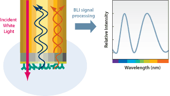 Bio-layer interferometry (BLI) is an optical biosensing technology that analyzes biomolecular interactions in real-time without the need for fluorescent labeling.[1] Alongside Surface Plasmon Resonance, BLI is one of few widely available label-free biosensing technologies, a detection style that yields more information in less time than traditional processes.[2] The technology relies on the phase shift-wavelength correlation created between interference patterns off of two unique surfaces on the tip of a biosensor.[3] BLI has significant applications in quantifying binding strength, measuring protein interactions, and identifying properties of reaction kinetics, such as rate constants and reaction rates.[4]
