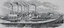 The iron industry grew during the 19th century, peaking around 1850–1860.[47] In 1863, there were 200 blast furnaces in the Black Country, of which 110 were in blast.[48] Two years later it was recorded that there were 2,116 puddling furnaces, which converted pig-iron into wrought iron, in the Black Country.[48] In 1864 the first Black Country plant capable of producing mild steel by the Bessemer process was constructed at the Old Park Works in Wednesbury.[48] In 1882, another Bessemer-style steel works was constructed at Spring Vale in Bilston by the Staffordshire Steel and Ingot Iron Company, a development followed by the construction of an open-hearth steelworks at the Round Oak works of the Earl of Dudley in Brierley Hill, which produced its first steel in 1894.[49]